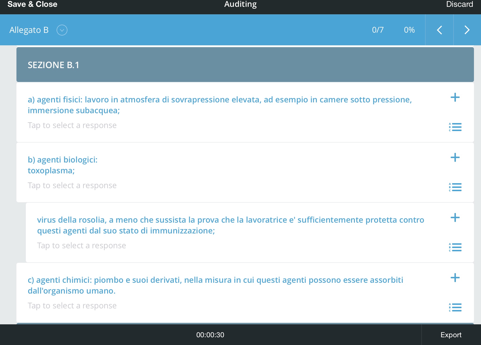 Il templete iAuditor si compone di 3 sezioni distinte le quali riportano fedelmente i temi di analisi degli allegati A,B,C del D.lgs. 151/01 ed ulteriori fattori comportanti il rischio per la lavoratrice.